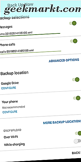 Nếu bạn đang tìm cách sao lưu các văn bản của mình, bạn nên định cấu hình SMS Backup để lưu các tệp XML của mình vào cả dịch vụ đám mây cùng với bản sao cục bộ để có các tùy chọn tốt nhất. Cần lưu ý rằng màn hình này cũng cho phép bạn chọn cách điện thoại của bạn sao lưu vào web; theo mặc định, thiết bị của bạn sẽ đợi cho đến khi kết nối với WiFi để tải tệp lên Google Drive, Dropbox hoặc OneDrive. Bạn có thể tắt tính năng này, ngoài việc bật khả năng chỉ tải lên khi đang sạc. Các tùy chọn ở đây giúp dễ dàng kiểm soát cách điện thoại của bạn kiểm soát dữ liệu của bạn được lưu vào đám mây, điều này thật tuyệt nếu bạn đang tìm kiếm một cách dễ dàng để đảm bảo rằng điện thoại của bạn không thổi dữ liệu di động và đốt pin bạn sử dụng nó.