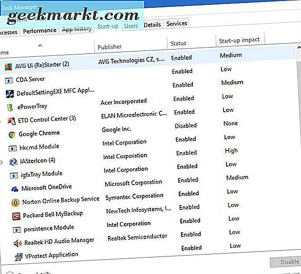 Start-up là một tab mới có trong Windows 10 Task Manager. Điều này cho bạn thấy tất cả các phần mềm mở ra khi khởi động. Nhấp vào mục khởi động ở đó và nhấn nút Tắt để xóa chương trình khỏi khởi động. Loại bỏ một số chương trình được liệt kê trên tab đó sẽ tăng tốc độ khởi động Windows 10.