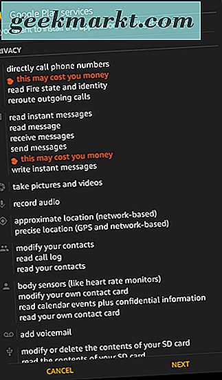 Làm việc theo cách của bạn từ cuối danh sách này và bắt đầu bằng cách cài đặt Trình quản lý tài khoản Google. Thật không may, hiện tại có một chút vấn đề với Fire OS 5.6.0.0, phiên bản cập nhật nhất của hệ điều hành do Amazon phát triển. Hoặc là nhờ vào một số chỉnh sửa của Amazon hoặc lỗi trong phần mềm, cố gắng cài đặt các ứng dụng này dẫn đến nút cài đặt màu xám. May mắn cho chúng tôi, bạn có thể khắc phục vấn đề này bằng cách sử dụng mẹo nhanh này: khi bạn đang ở trên màn hình cài đặt với biểu tượng màu xám, chỉ cần tắt màn hình thiết bị, sau đó bật lại và mở khóa thiết bị của bạn. Cuộn xuống cuối trang cài đặt ứng dụng một lần nữa và bạn sẽ thấy nút "Cài đặt" một lần nữa hoạt động trên thiết bị của bạn. Cách giải quyết thay thế liên quan đến việc nhấn vào biểu tượng đa nhiệm / ứng dụng gần đây một lần, sau đó chọn lại trang cài đặt ứng dụng từ danh sách ứng dụng gần đây của bạn và bạn sẽ thấy nút “Cài đặt” sáng lên màu cam.
