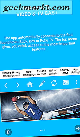 Không giống như AllCast, tập trung chủ yếu vào phát trực tuyến phương tiện truyền thông địa phương (mặc dù AllCast hỗ trợ Plex trong phiên bản trả phí), ứng dụng được đề xuất thứ hai của chúng tôi tập trung chủ yếu vào phương tiện truyền thông trực tuyến thông qua các trang web và các nguồn trực tuyến khác. Ứng dụng này được gọi là Video và Truyền hình và trong khi có một số phiên bản của ứng dụng này có sẵn để tải xuống, ứng dụng chúng tôi sẽ xem xét, không ngạc nhiên, có liên quan đến hộp Roku ngồi bên dưới TV của bạn. Với ứng dụng này, bạn sẽ có thể truyền nội dung từ các trang web yêu thích của mình trực tiếp từ trình duyệt đi kèm được cung cấp cùng với ứng dụng trên máy tính bảng của bạn. Chỉ cần sử dụng ứng dụng để duyệt đến trang web bạn chọn, sau đó chọn biểu tượng phát trực tiếp được tích hợp trong ứng dụng để bắt đầu truyền video tới Roku của bạn. Video và TV Cast có trình chặn quảng cáo được tích hợp sẵn, việc này sẽ giảm số lượng quảng cáo bạn sẽ thấy trong khi sử dụng ứng dụng. Tương tự, bạn cũng có thể lưu các trang web trong trình duyệt dấu trang trong ứng dụng, điều này làm cho việc tải lại trang web trở nên dễ dàng khi duyệt tìm nội dung mới.