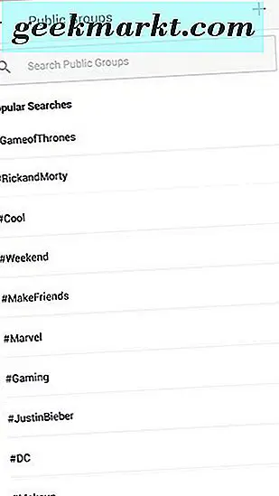 Màn hình chính cho các cuộc trò chuyện công khai hiển thị các tìm kiếm phổ biến với thẻ bắt đầu bằng # ở phía trước nhóm, cùng với tùy chọn để dễ dàng tìm kiếm qua các nhóm trực tuyến. Không ngạc nhiên, nhiều nhóm được dựa trên các phương tiện thông dụng: Game of Thrones, Rick và Morty, Justin Bieber, Marvel và DC đều được xếp hạng trong số những tìm kiếm hàng đầu trên mạng. Các cộng đồng nhóm trên Kik có số lượng giới hạn không gian để mọi người tham gia — năm mươi người dùng cùng một lúc. Điều này có nghĩa là khi một nhóm truy cập năm mươi thành viên, nó sẽ được lấp đầy cho đến khi một người nào đó rời nhóm. Và điều này không chỉ có nghĩa là rời khỏi giao diện trò chuyện, nhưng thực sự nhấn tùy chọn "Rời khỏi nhóm" trong cài đặt nhóm. Khi bạn đã tham gia một nhóm, cuộc trò chuyện nhóm đó sẽ ở lại trong hộp thư đến của bạn cho đến khi bạn rời khỏi nhóm. Trong thử nghiệm của chúng tôi, một số nhóm hoạt động tích cực hơn những nhóm khác. Một số nhóm vẫn hoàn toàn im lặng mặc dù có đầy đủ năm mươi người dùng, trong khi những nhóm khác khá tích cực. Khi mọi người rời khỏi nhóm (thường do không hoạt động), một điểm sẽ mở để người dùng mới tham gia, đó là lý do tại sao bạn thường thấy các nhóm được liệt kê ở 49 trong số 50 thành viên.