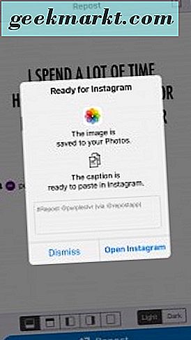- Nhấn vào nút đăng lại màu xanh lam ở cuối màn hình điện thoại của bạn. Ứng dụng đăng lại lưu ảnh vào ảnh của bạn. Một thông báo Sẵn sàng cho Instagram bật mở, nhấn Mở Instagram.