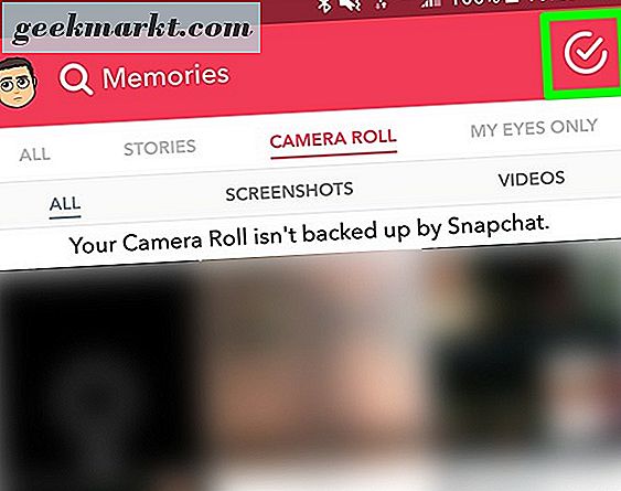 Để bắt đầu Câu chuyện của bạn, hãy mở chế độ xem Kỷ niệm bằng cách nhấn vào biểu tượng ảnh nhỏ — có vẻ như hai hình chữ nhật chồng lên nhau — bên dưới nút chụp trong kính ngắm máy ảnh. Các ký ức được chia thành ba tab riêng biệt, như được mô tả ở trên: Snaps, Camera Roll và mật khẩu được bảo vệ bằng My Eyes Only. Bạn có thể sử dụng phương pháp này với bất kỳ một trong ba tab và bạn không bị giới hạn chỉ một tab. Bạn có thể thêm ảnh từ cả ba phần của Memories bên trong Snapchat, hoặc chỉ với một ảnh. Để bắt đầu chọn ảnh, hãy nhấn vào biểu tượng dấu kiểm ở góc trên bên phải của màn hình. Bạn sẽ thấy giao diện chuyển sang “Chọn…” và một thanh màu hồng đỏ sẽ xuất hiện dọc theo cuối màn hình của bạn. Điều này có nghĩa là bạn đang ở chế độ đa lựa chọn, bạn phải sử dụng chế độ này để thêm nhiều ảnh hoặc video vào Story của bạn cùng một lúc.