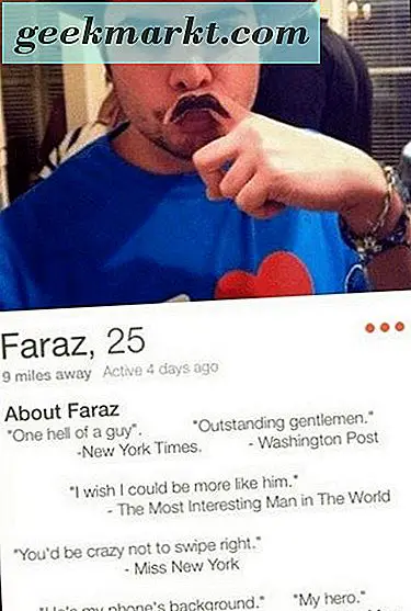 Ví dụ, bằng cách sử dụng phương pháp đánh giá nhà hát của ví dụ cuối cùng ở trên là tuyệt vời. Đó là hài hước, được điểm trên và được đảm bảo để có được một tiếng cười. Đừng sao chép nó mặc dù, chỉ cần sử dụng nó cho cảm hứng. Hãy nhớ rằng, hầu hết người dùng sẽ thấy hàng trăm hoặc hàng nghìn ứng dụng hẹn hò trong bất kỳ tuần nào cho nên bạn phải là người gốc.